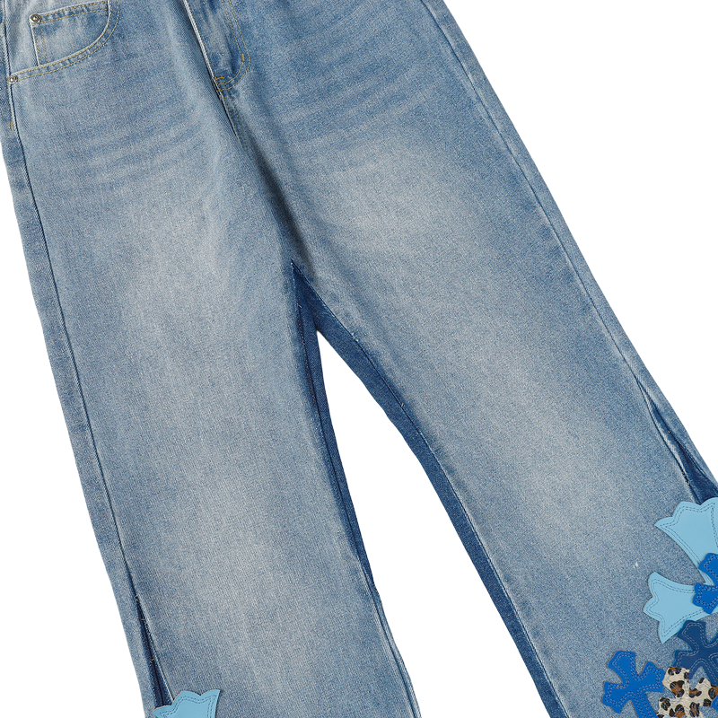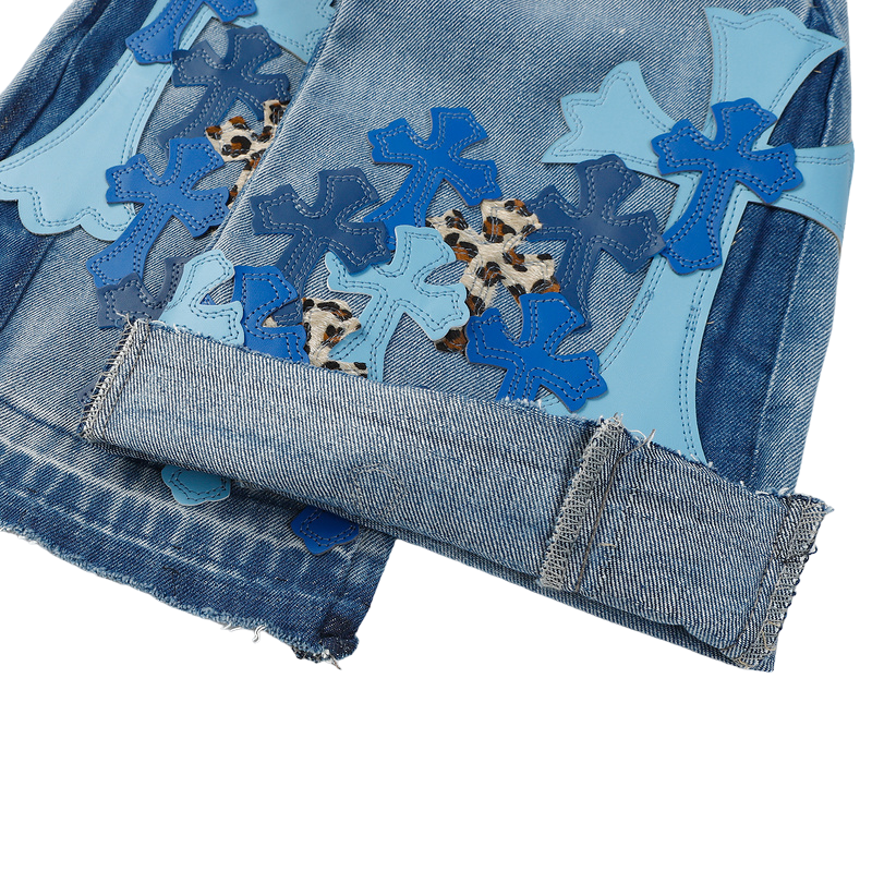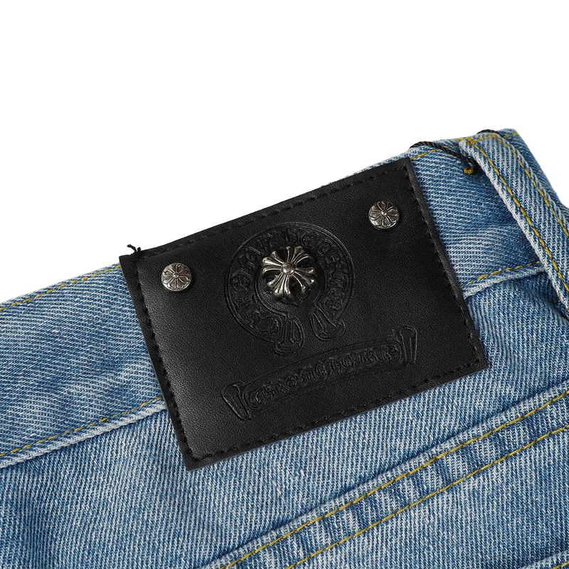 - Leather Label Detailing: The standout feature of these jeans is the authentic Chrome Hearts leather label, which adds a touch of refinement and exclusivity. Embossed with the brand’s iconic logo, the label highlights the premium craftsmanship that Chrome Hearts is known for.