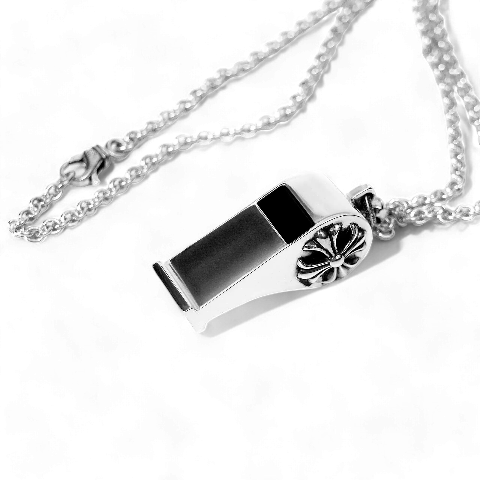 The plus whistle pendant is part of the unique whistle series from Chrome Hearts. The inspiration for this design came to Richard Stark, the creator of Chrome Hearts when he saw his P.E. teacher wear a whistle around his neck during class.