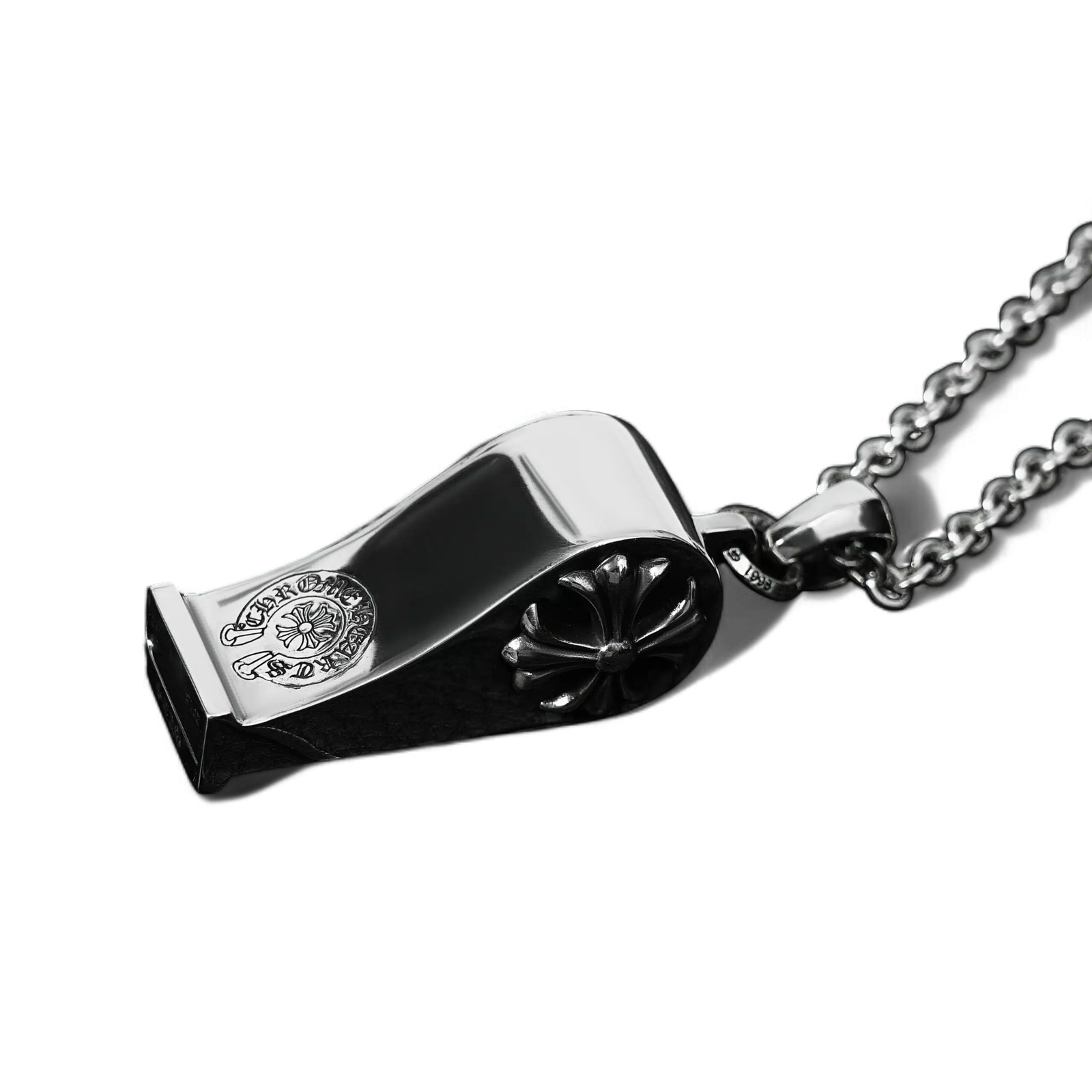 The plus whistle pendant is part of the unique whistle series from Chrome Hearts. The inspiration for this design came to Richard Stark, the creator of Chrome Hearts when he saw his P.E. teacher wear a whistle around his neck during class.