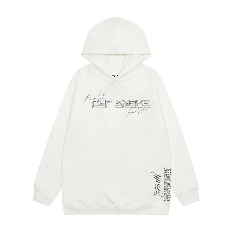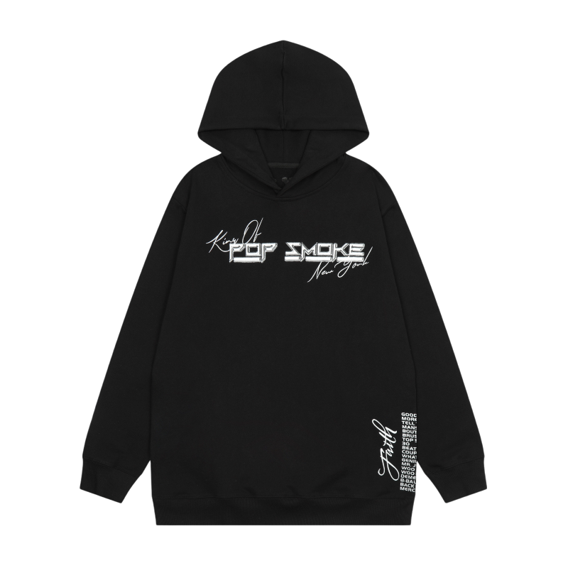 - Iconic Imagery: Featuring a striking graphic of Pop Smoke’s face alongside the “King of New York” and “Faith” motifs, this hoodie is a bold statement piece for any fan.